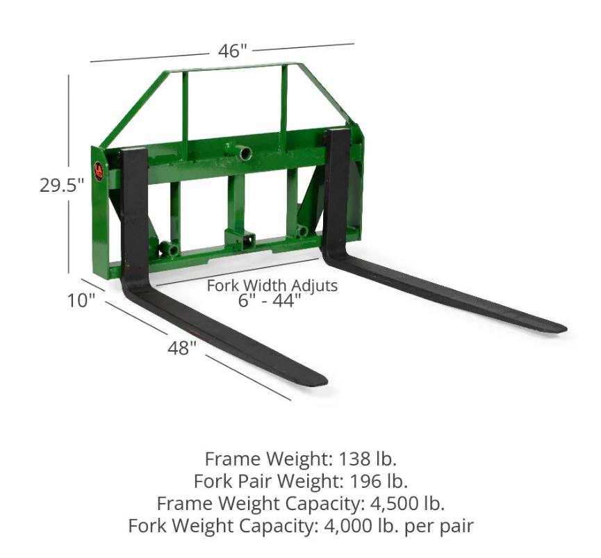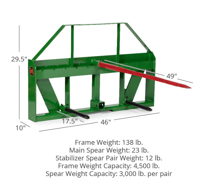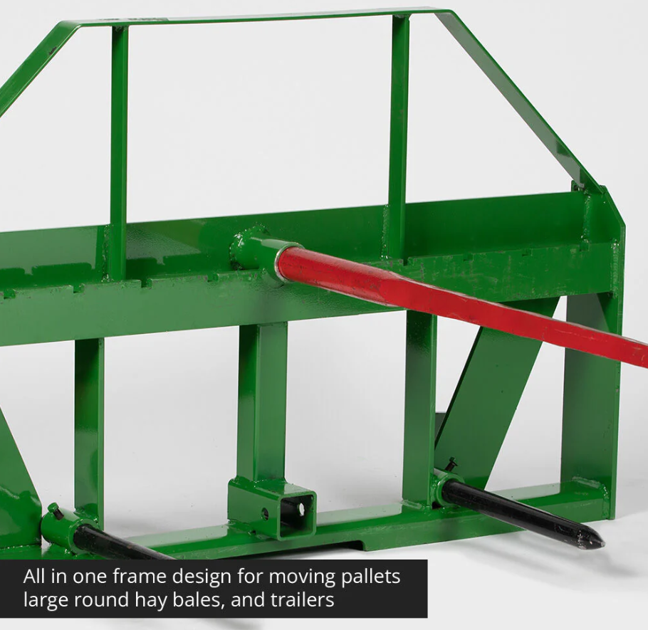 Les fourches de foin Frame & Pallet sont équipées d'une paire de fourches de 480 pouces et d'une lance de balles de foin de 49 pouces et de deux lances de stabilisateur, et est compatible avec les chargeurs John Deere équipés du système de montage de style global.