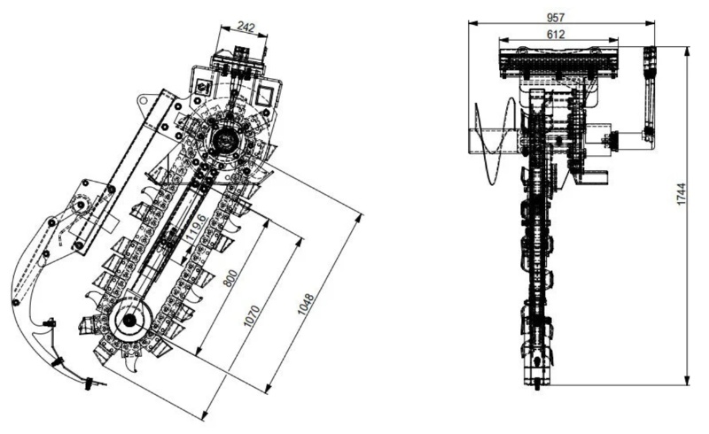 L'accessoire de tranchée est équipé d'un pied de contrôle de profondeur réglable qui garantit une profondeur de tranchée constante. Trois chaînes différentes sont disponibles pour s'adapter à divers types de terrains : terre, rocheux, béton, asphalte et même gelé. Nos trancheuses sont fabriquées en interne selon les normes de qualité les plus strictes du secteur, assurant ainsi fiabilité et performance.